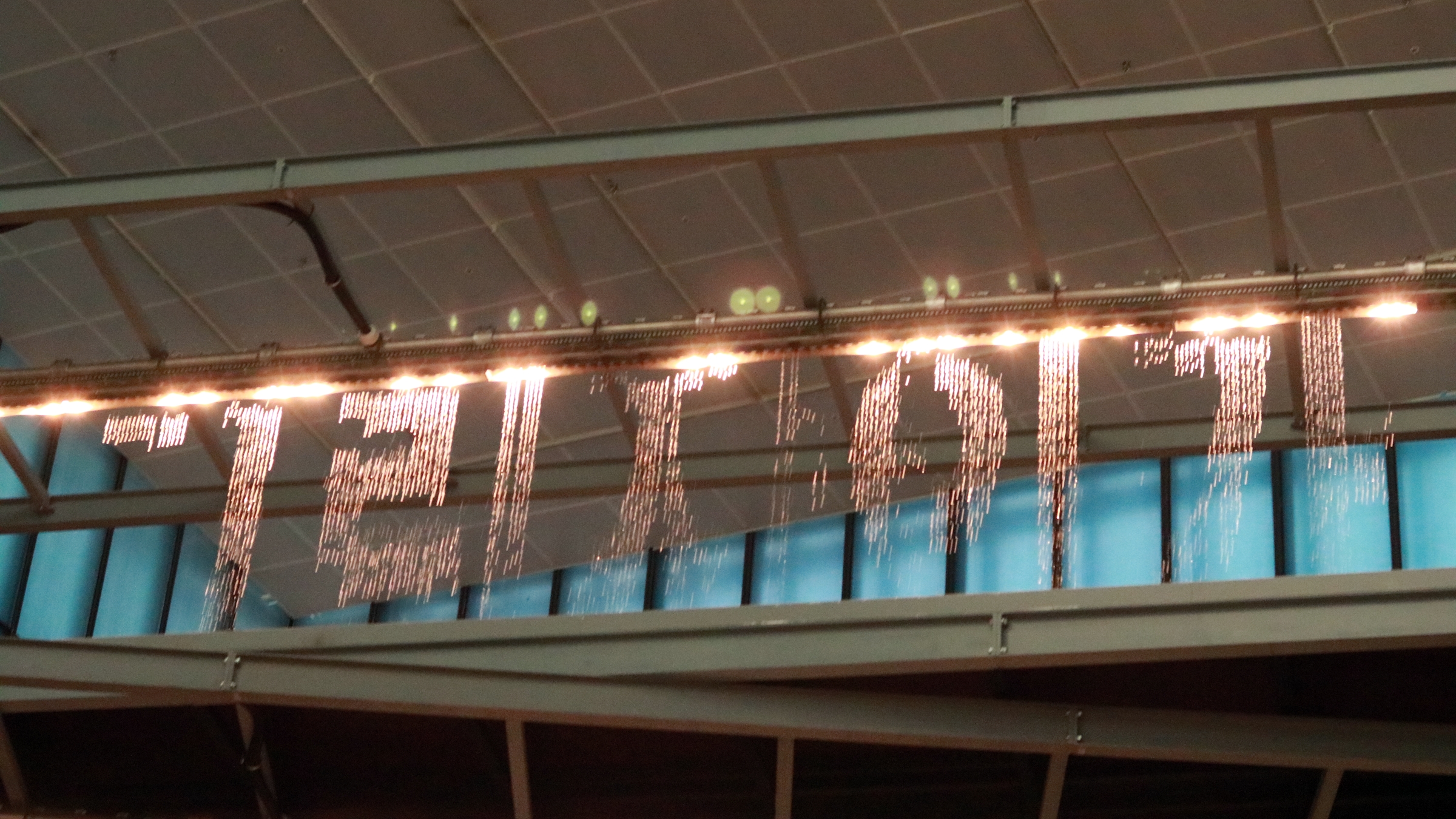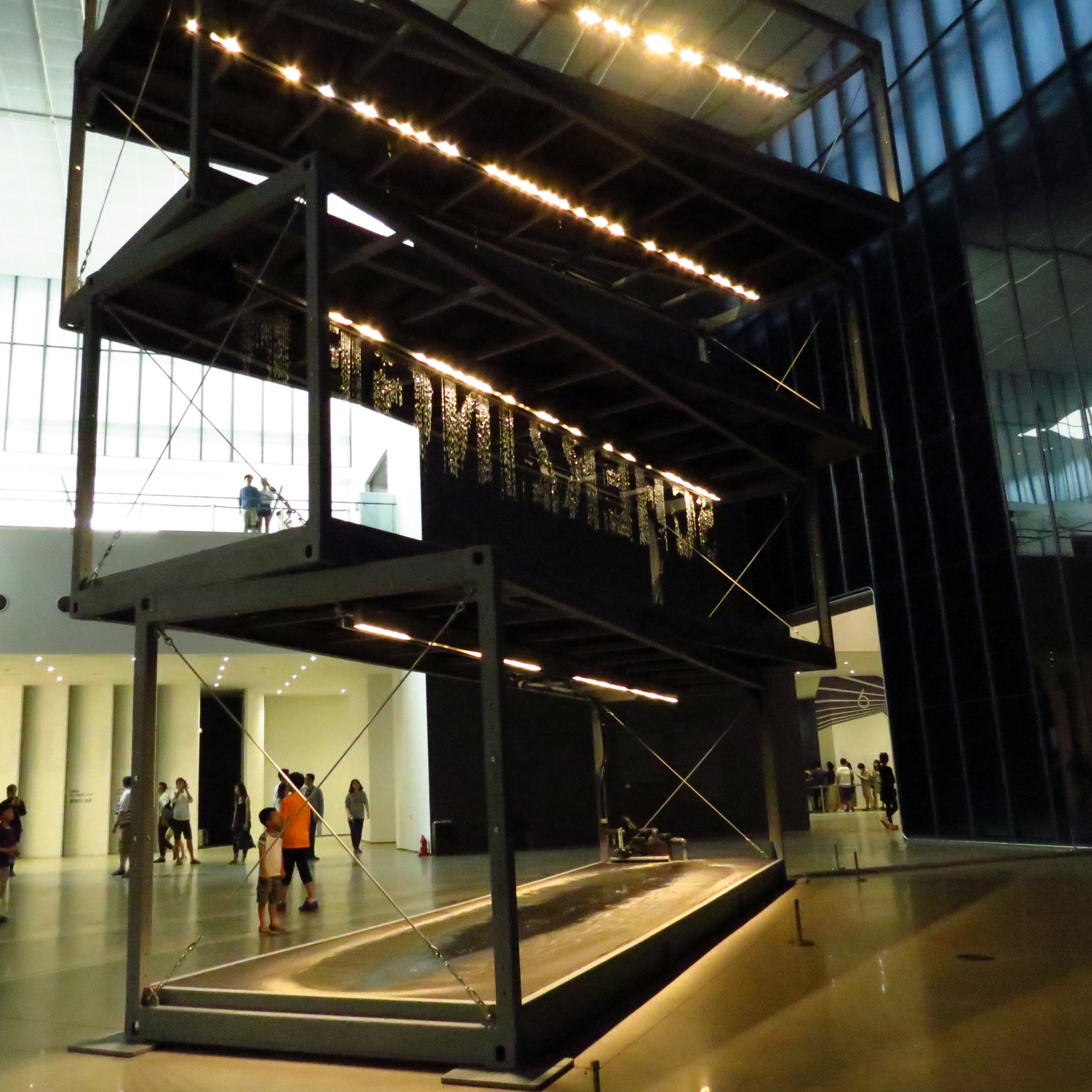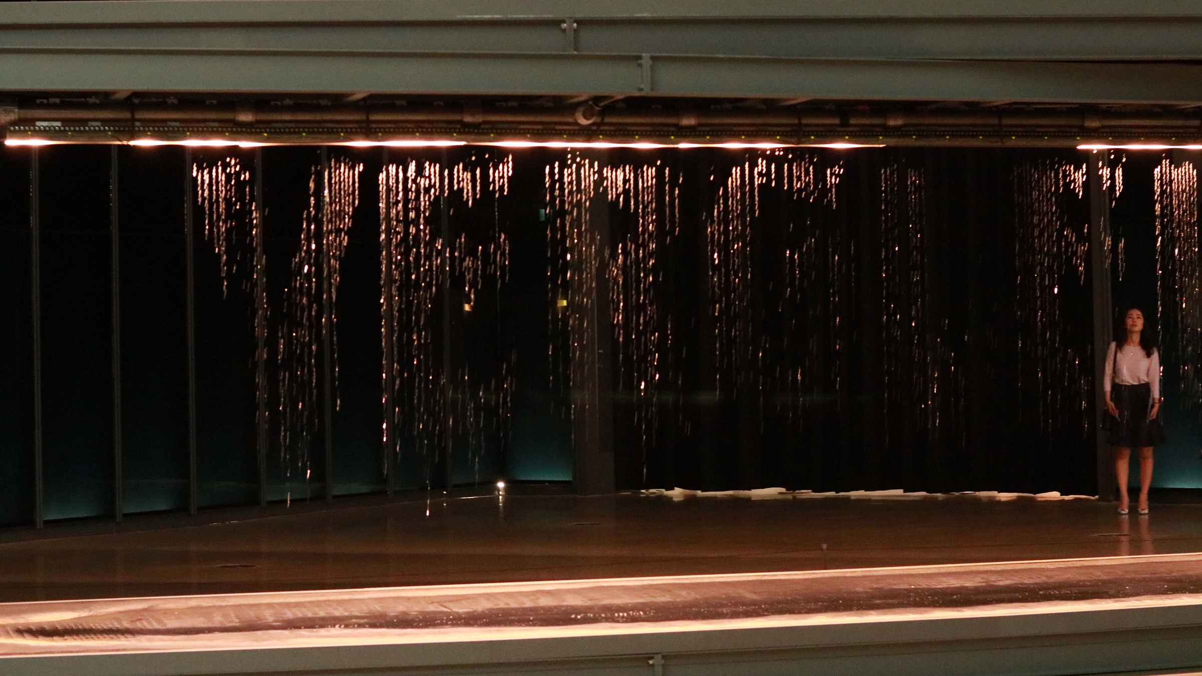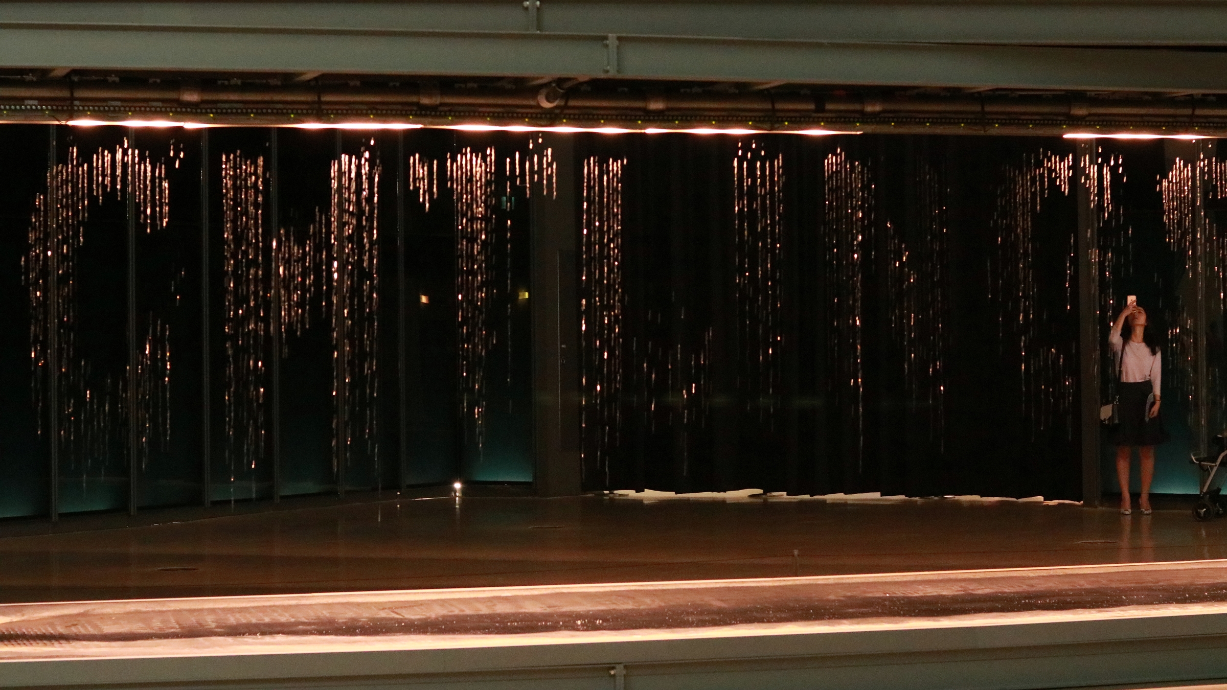 4층의 거대한 구조물에 물이 글씨를 이루며 내려오는 독특한 조형물입니다. 떨어지는 아주 짧은 시간 동안에만 읽을 수 있고, 이는 빠르게 사라지는 정보를 의미한다고...