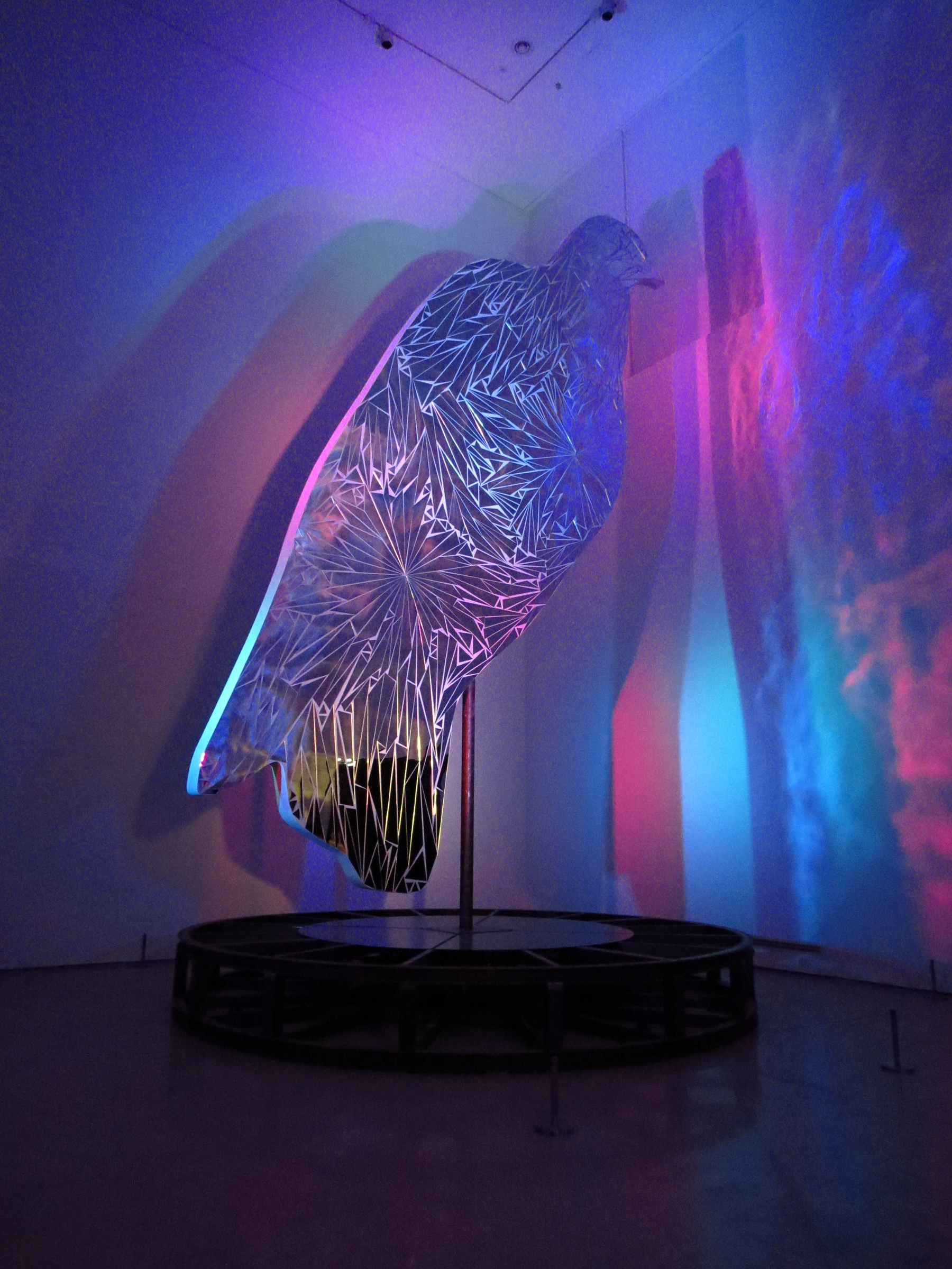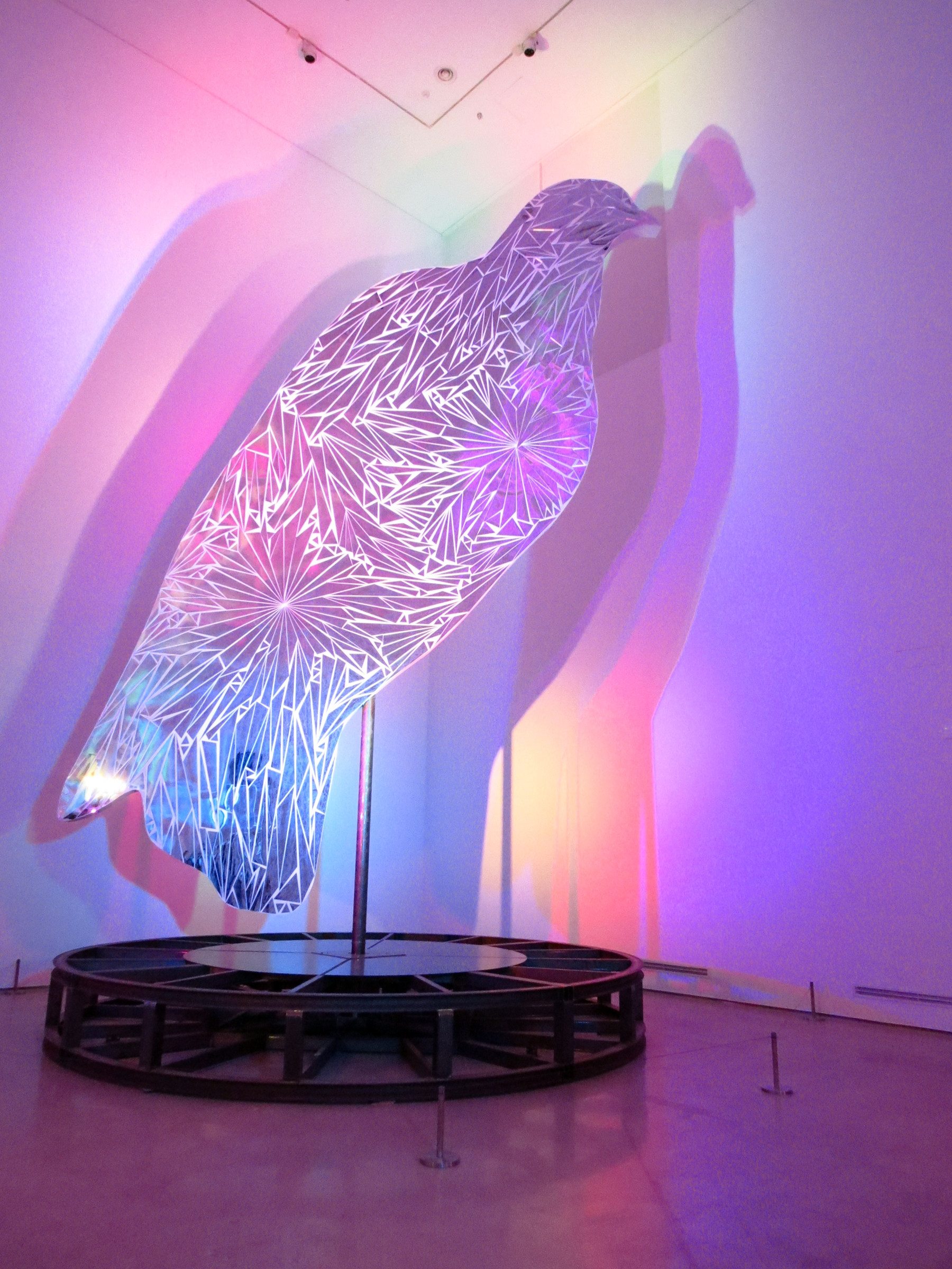 회전하는 거대한 비둘기 모형과 그 위에 그려지는 조명 및 영상을 만나게 됩니다.